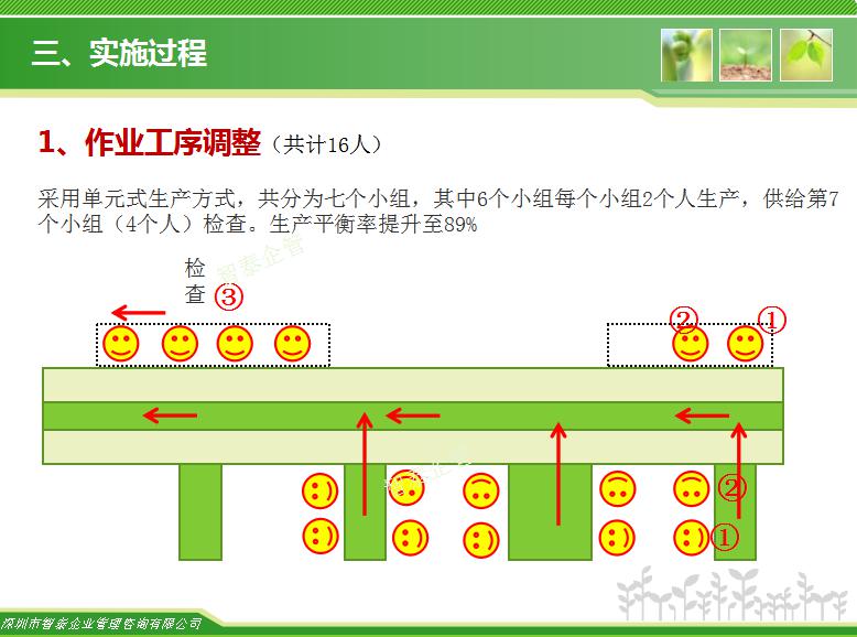 在精益生产中车间经常要改进的内容是生产线上的生产平衡率问题,目前国内加工型企业的生产平衡率只有65%左右,对于智泰专业团队来说,这里面的改善空间巨大,通过智泰人的努力,在企业推进生产平衡率平均提升到85%以上,阶段为生产效率提升案例,请查阅: